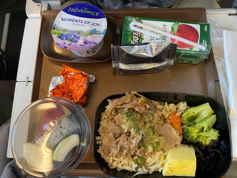 這次的飛機餐是跟胡同合作的燒肉飯…口味偏鹹,不太好吃…