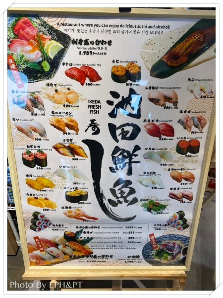 咕嚕嚕,我們的肚子開始有點餓了看到一家覺得還不錯的池田壽司店,決定來挑戰看看日本的生魚片!!!!!!