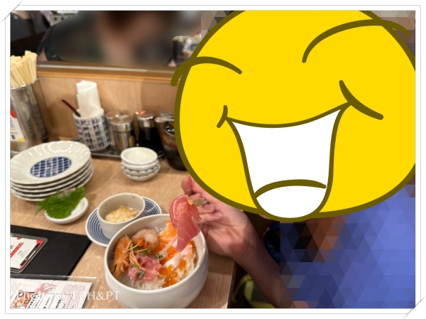 我們的生魚片丼也上來了,上面有一大片一大片的鮪魚、鮭魚還有甜蝦跟鮭魚卵,超豪華的!